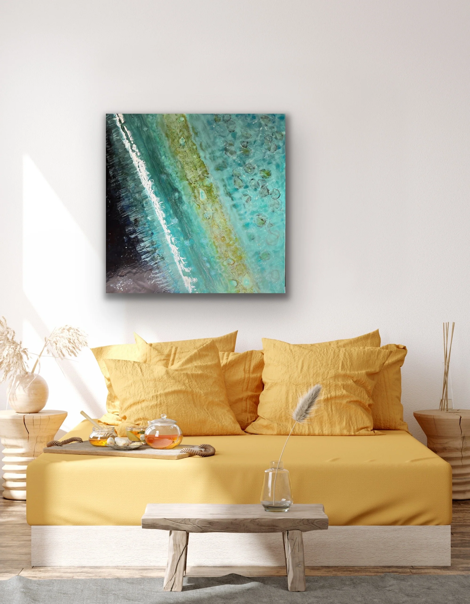 Across the panel, you can dive into the detail of channels; the bombora wash of the waves coming in from the deep; the submerged corals and its quiet centre.