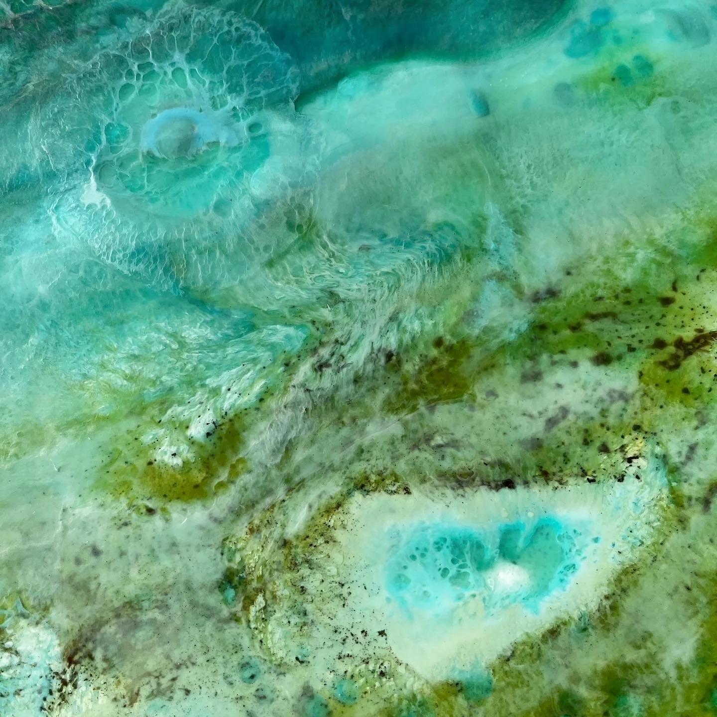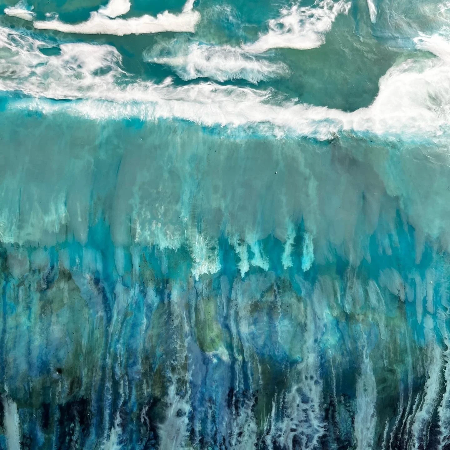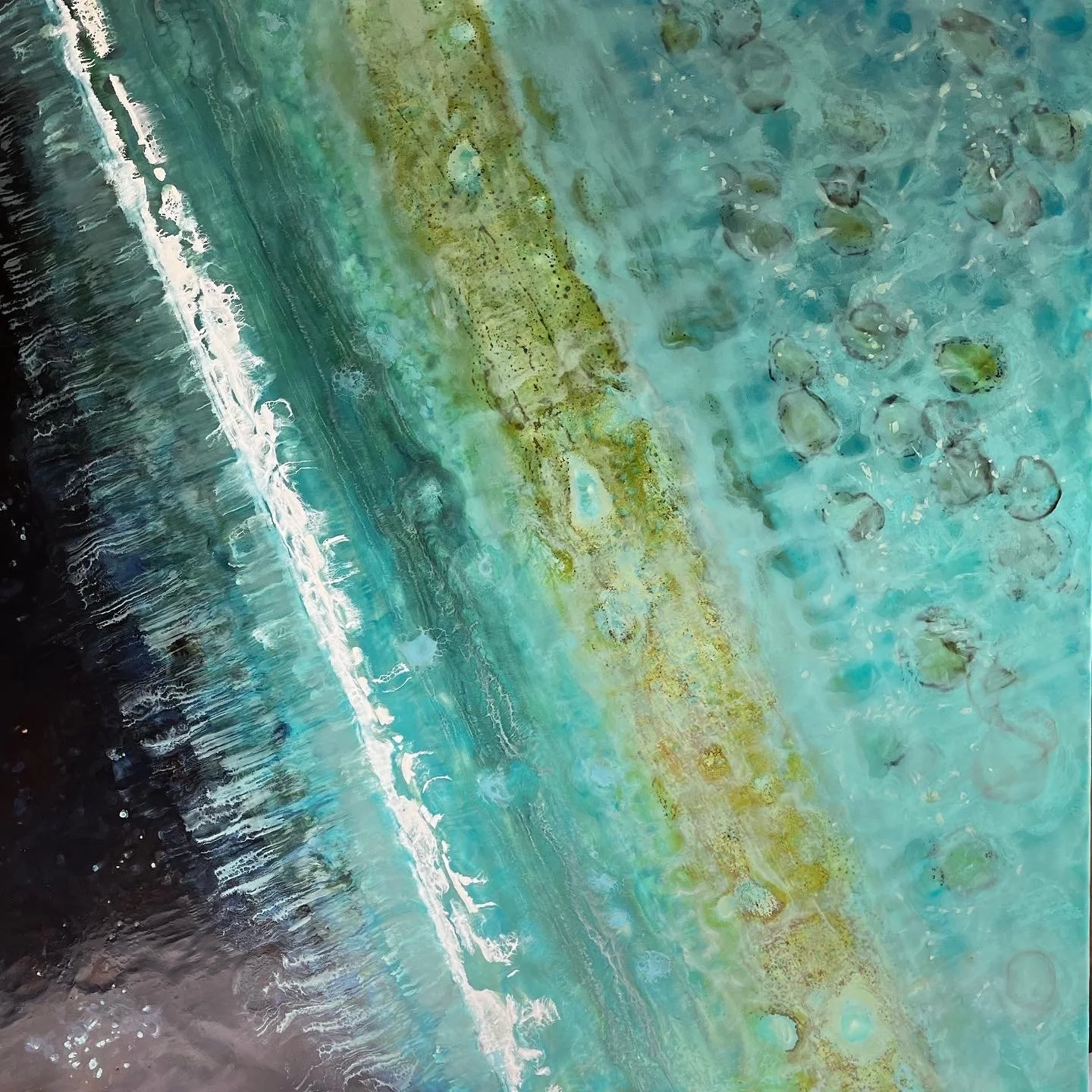 This large 90 X 90cm square panel, is painted in encaustic wax medium, in the blues, ink-blacks and turquoises of the south Pacific.