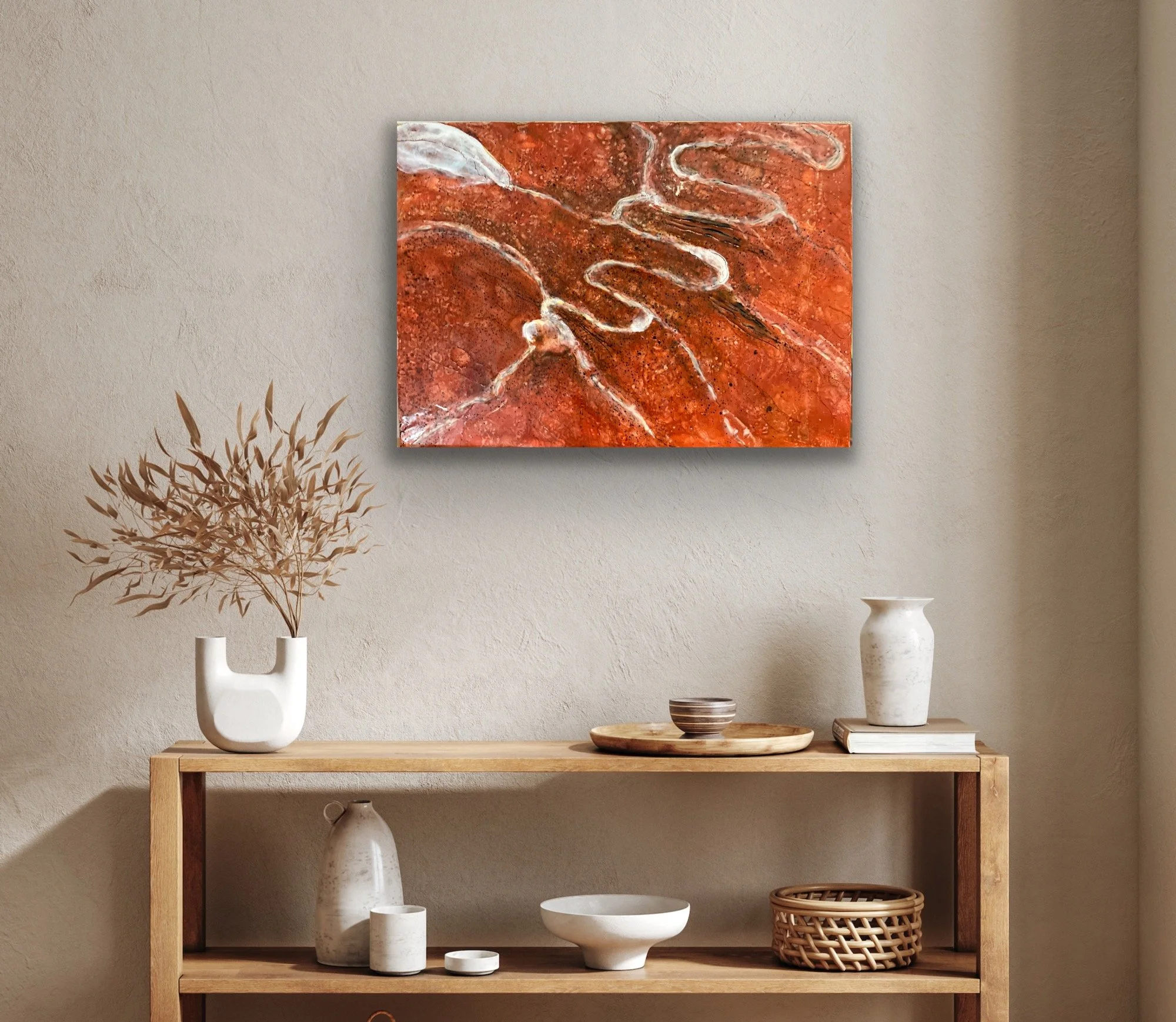 "COOPER CREEK" Encaustic 303 X 30cm. Inspired by the slow but steady flows of floodwater that makes its way from central Queensland, via systems like Cooper Creek toward Australia's central basins.