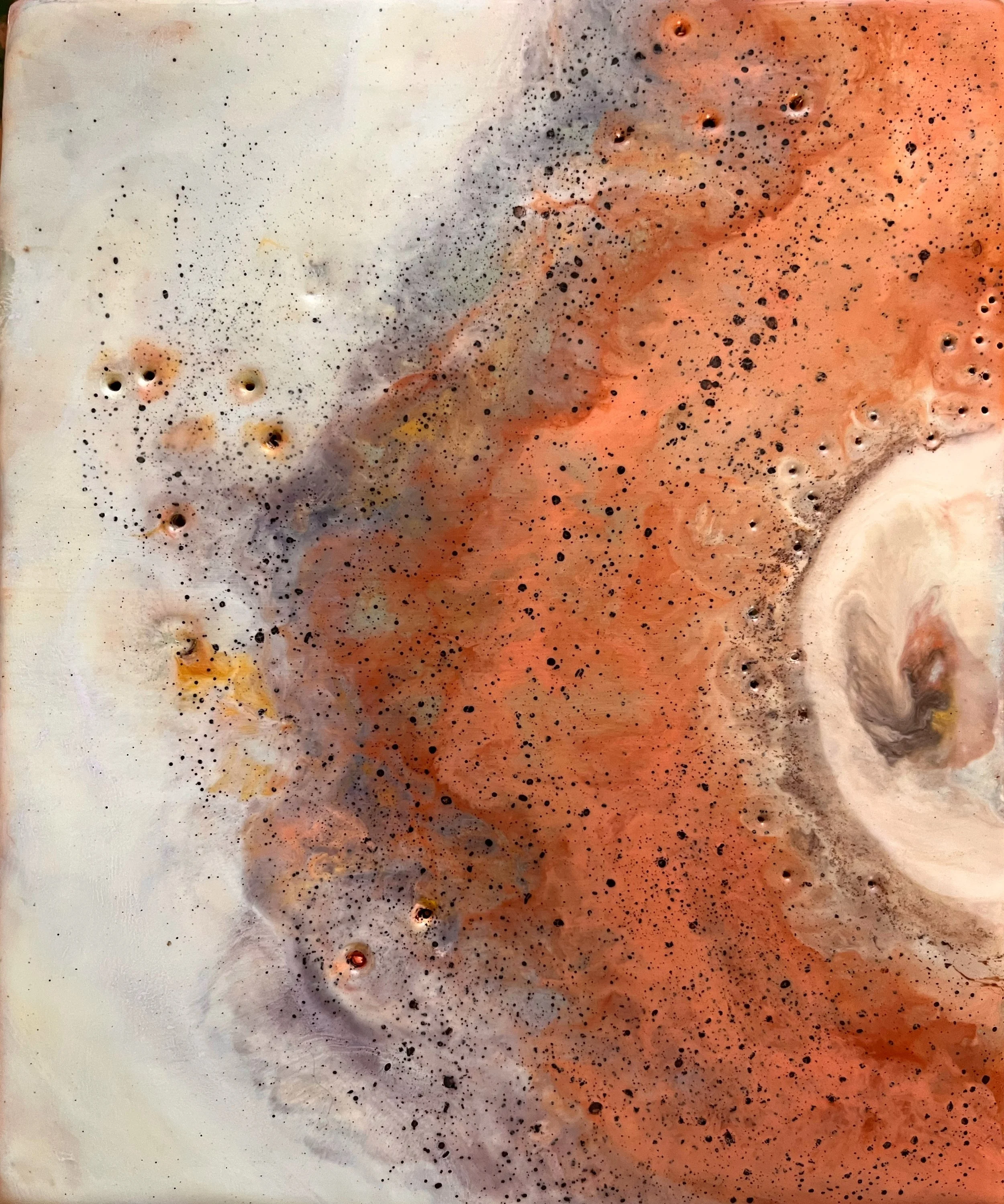 "FINDING ITS WAY" 2025 Encaustic 20 X 25cm. Inspired by the magic of the Great Artesian Basin, as it fills down to Kati Thanda (Lake Eyre) in SAs central outback.